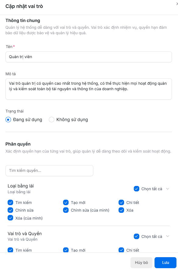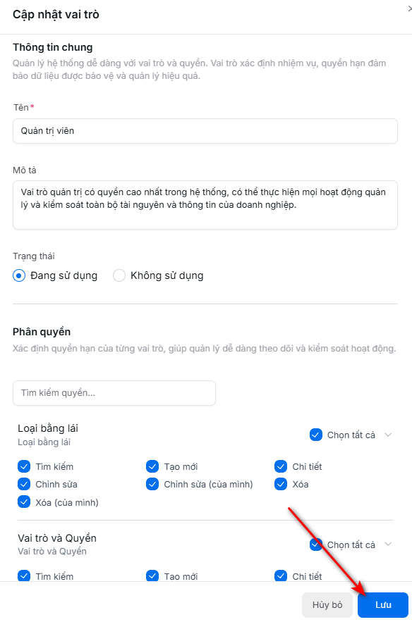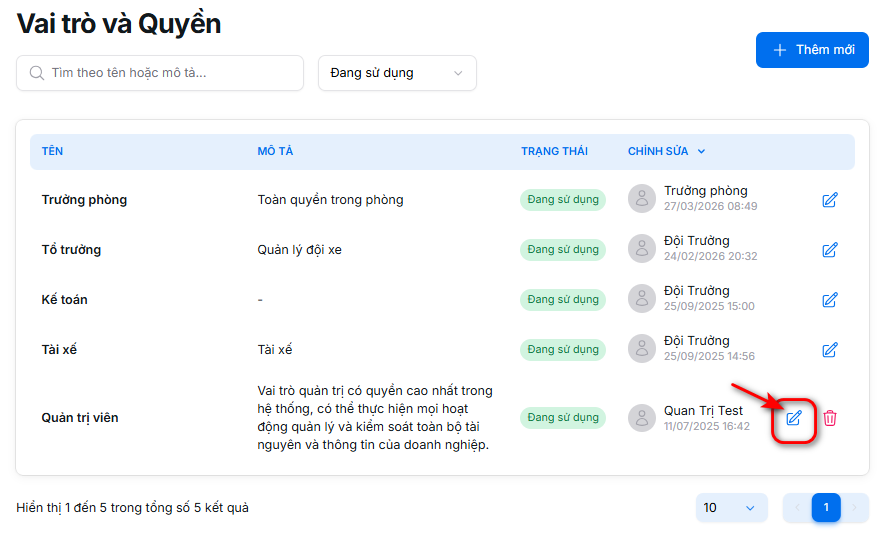 - Người dùng ấn vào biểu tượng chỉnh sửa để bắt đầu chỉnh sửa vai trò bao gồm tên vai trò, mô tả và tất cả các quyền