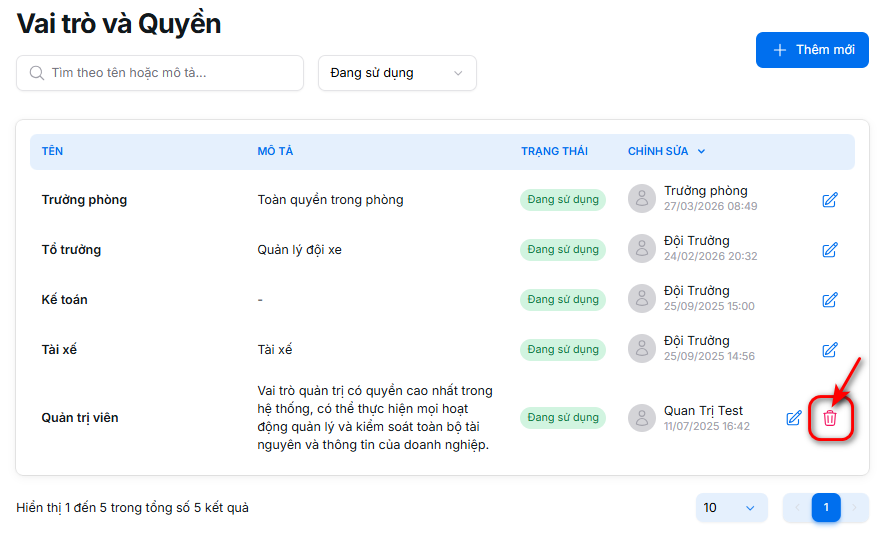 - Người dùng có thể xóa vai trò bằng cách ấn vào biểu tượng xóa