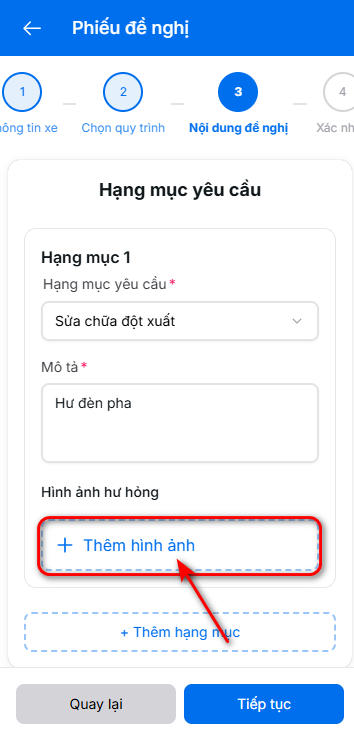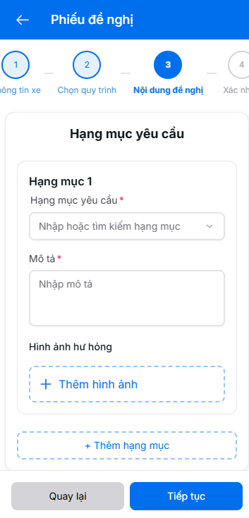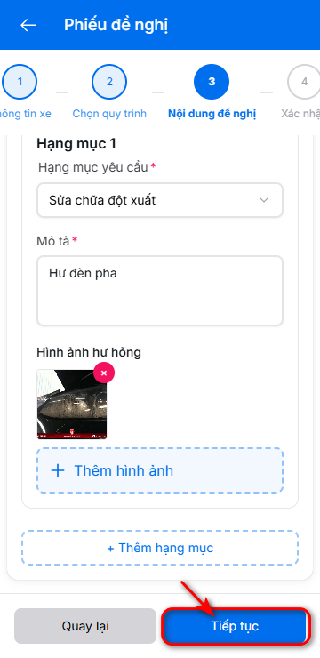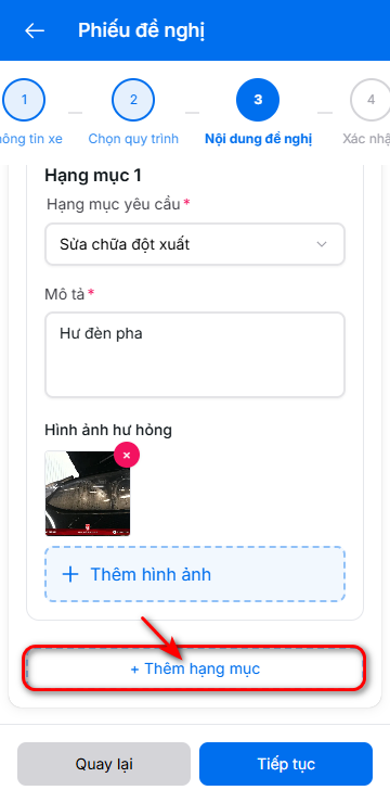 - Có thể thêm nhiều hạng mục khi xe hư hại nhiều chỗ bằng cách nhấn nút thêm hạng mục