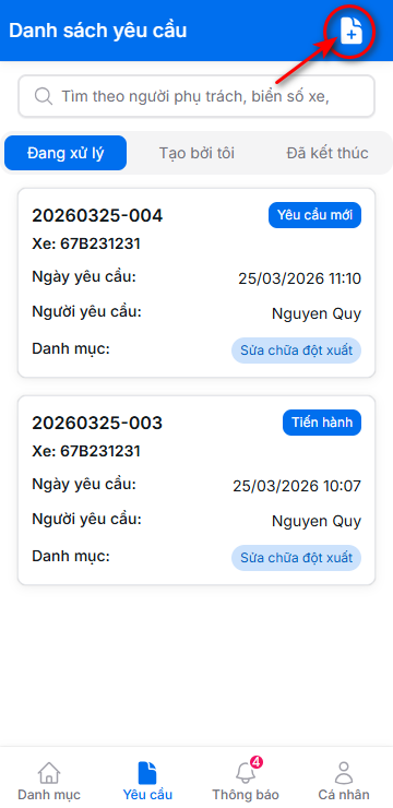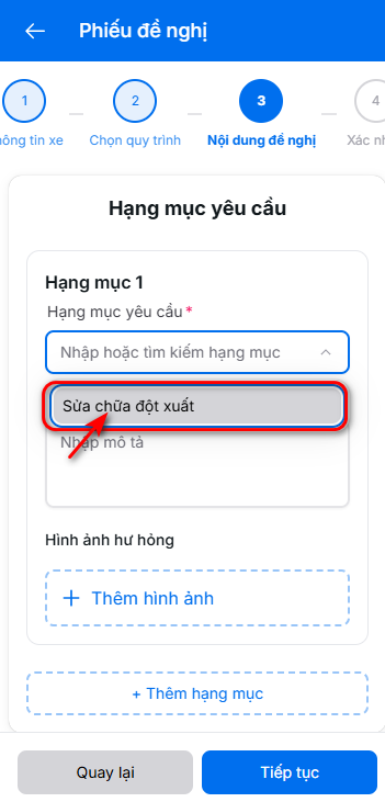 Bước 1: Tạo yêu cầu sửa chữa đột xuất khi xe hư hỏng