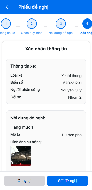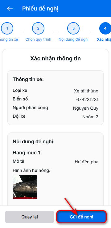 6. Xác nhận thông tin và ấn nút gửi đề nghị để gửi đến cho đội trưởng và trưởng phòng