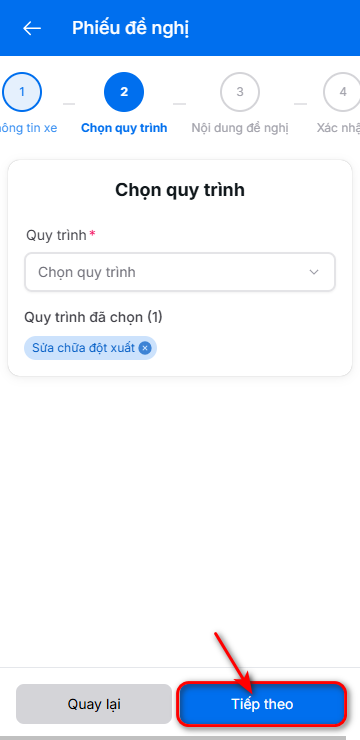 - Bấm vào khung chọn quy trình sau đó chọn sửa chữa đột xuất