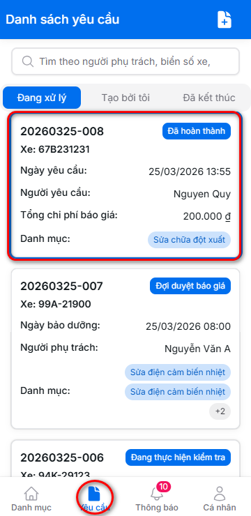 1. Người phụ trách mở yêu cầu đã được hoàn thành ở mục yêu cầu