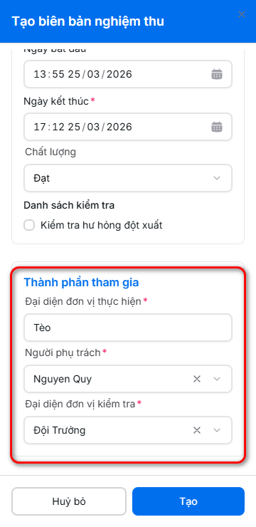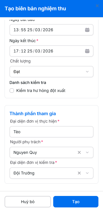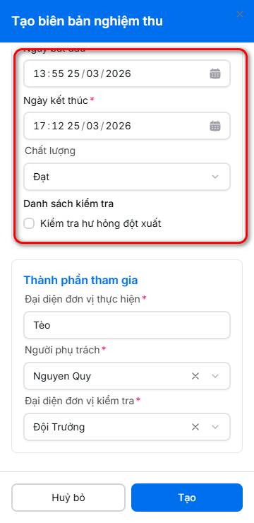 2. Người phụ trách bấm vào nút "Tạo biên bảng nghiệm thu" để mở màn hình nhập thông tin nghiệm thu và nhập thông tin
