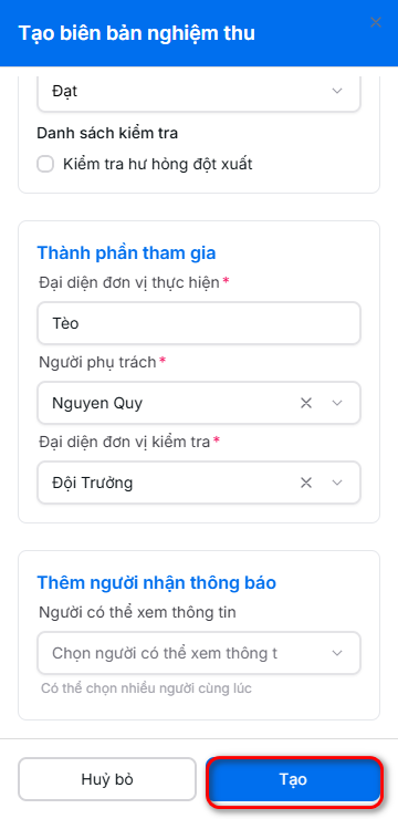 5. Sau đó bấm "Tạo" để tạo bản nghiệm thu và gửi cho tất cả kế toán
