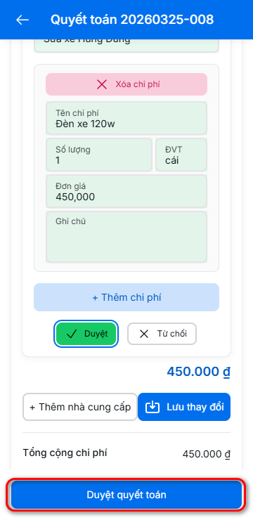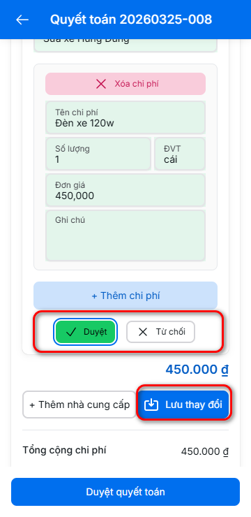- Trưởng phòng sẽ duyệt các khoản phí và lưu thay đổi