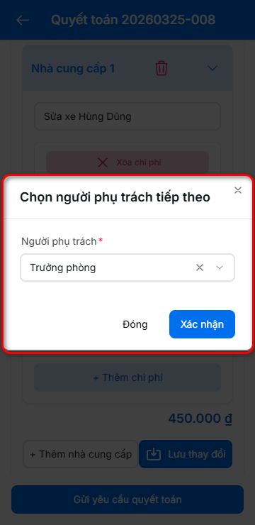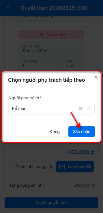 - Ở mục quyết toán, trưởng phòng sẽ duyệt yêu cầu quyết toán vừa được gửi.