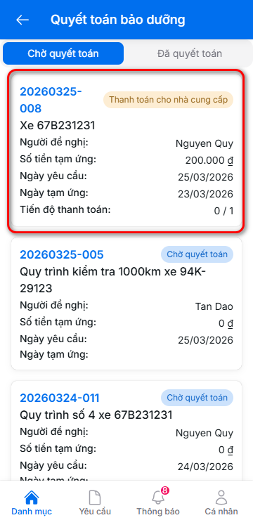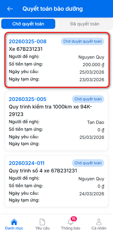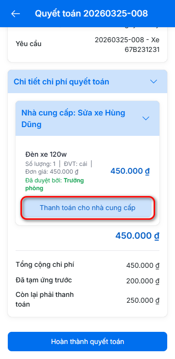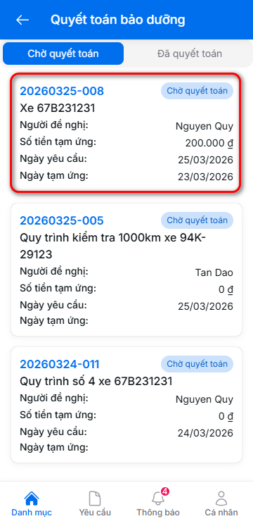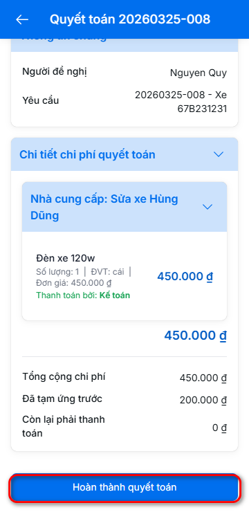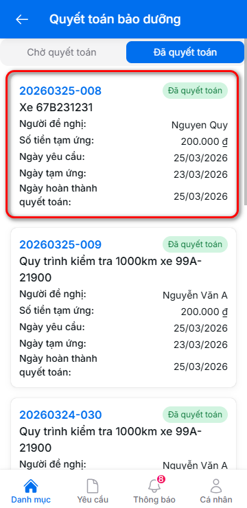- Trạng thái của yêu cầu sẽ chuyển sang đã quyết toán.