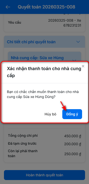 - Sau khi hoàn thành thanh toán cho toàn bộ nhà cung cấp, kế toán bấm vào hoàn thành quyết toán để hoàn thành quyết toán
