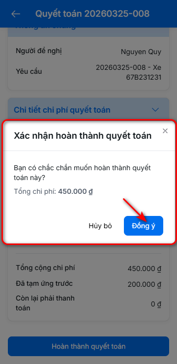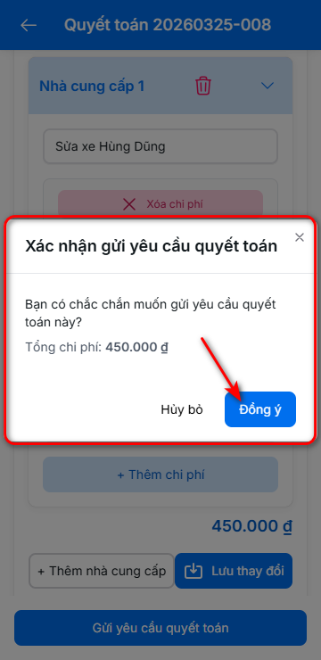 4. Bấm nút gửi yêu cầu quyết toán, xác nhận để gửi cho trưởng phòng duyệt