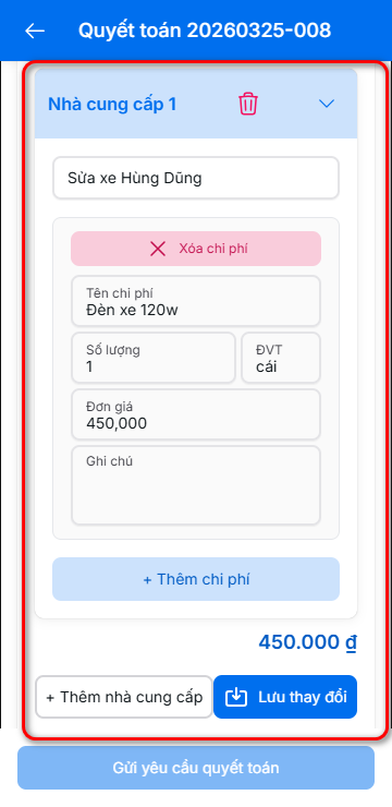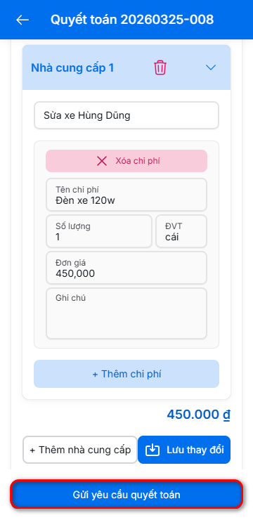 Bước 11: Nhập liệu chi phí thực tế và bấm "Quyết toán"