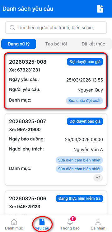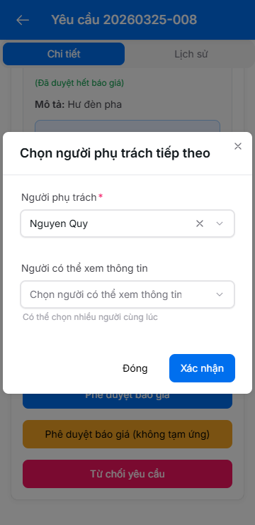 - Người phụ trách sẽ mở yêu cầu duyệt báo giá ở mục yêu cầu