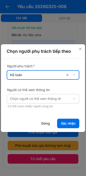 - Nếu đồng ý chi tạm ứng thì người phê duyệt sẽ ấn vào Phê duyệt báo giá. Sau đó, chọn người phụ trách tiếp theo là kế toán và bấm vào Xác nhận.Yêu cầu sẽ chuyển sang cho kế toán để chi tạm ứng (bước 7).