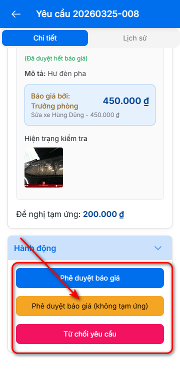 - Nếu không đồng ý chi tạm ứng thì người phê duyệt sẽ ấn vào Phê duyệt báo giá (không tạm ứng). Sau đó, chọn người phụ trách tiếp thep là người tài xế phụ trách sửa chữa và bấm vào Xác nhận để thông báo đến tài xế tiến hành sửa chữa (bước 8).