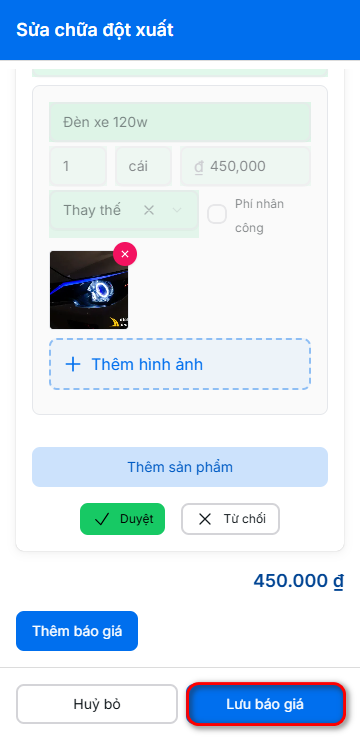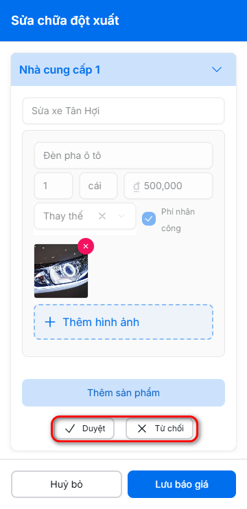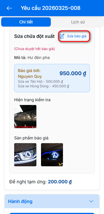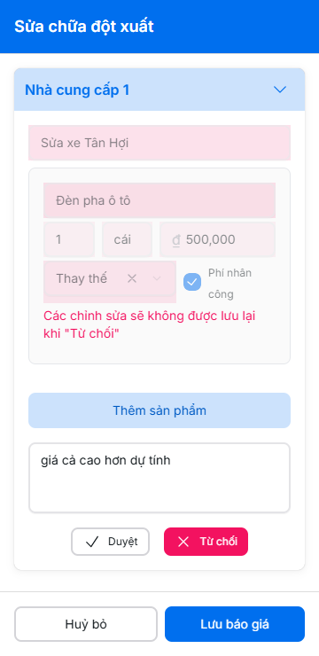 - Người phụ trách bấm vào mục sửa báo giá để duyệt từng mục