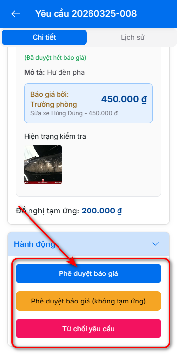 - Nếu được báo giá Phê duyệt, hệ thống sẽ cần người tiếp theo xác nhận chốt lại cho phép sửa chữa để gửi thông báo cho kế toán chi tiền(Thường là trưởng phòng)