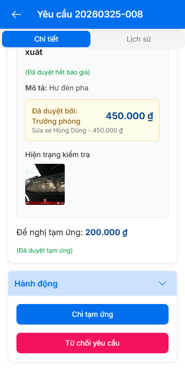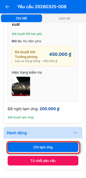 - Nếu không đồng ý chi tạm ứng sẽ bấm vào nút Từ chối yêu cầu. Sau đó, tài xế sẽ nhận được thông báo đã từ chối tạm ứng và tiến hành bước tiếp theo