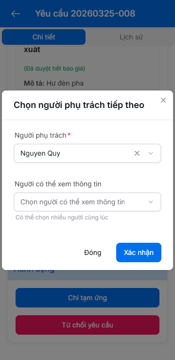 - Nếu đồng ý chi tạm ứng sẽ bấm vào nút Chi tạm ứng. Sau đó, chọn tài xế phụ trách rồi bấm xác nhận. Tài xế đố sẽ nhận được thông báo đã được chi tạm ứng và tiến hành bước tiếp theo