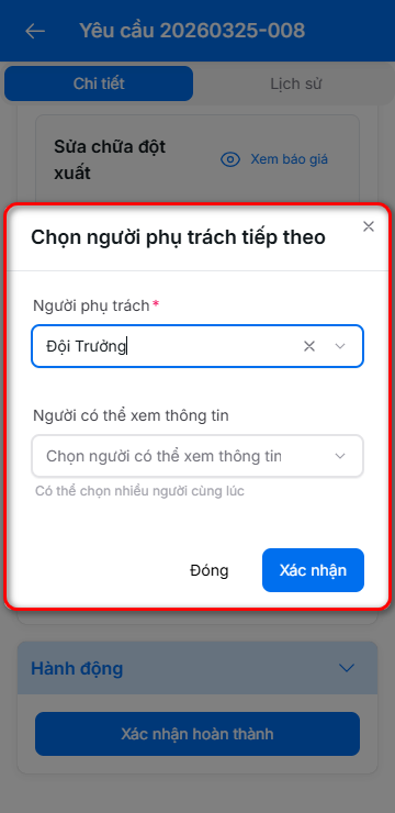 2. Tài xế sẽ chọn người phụ trách tiếp theo để tạo biên bản nghiệm thu ở bước tiếp theo và bấm "xác nhận"