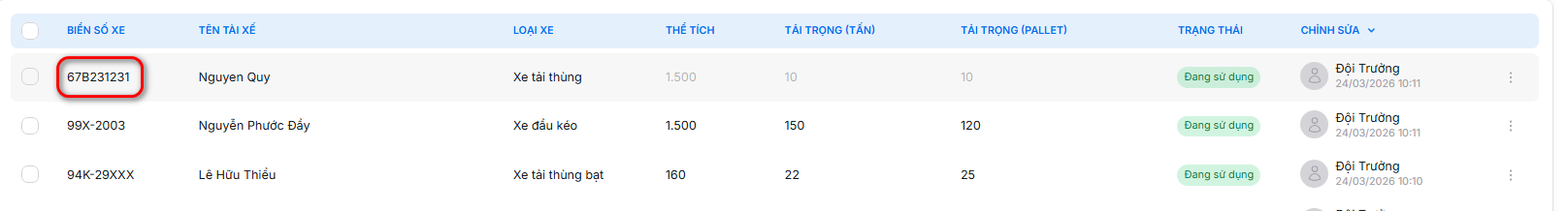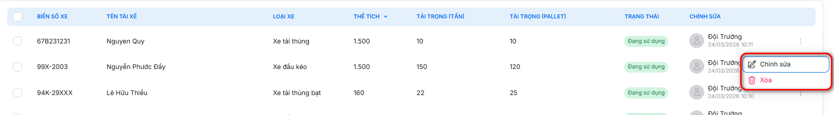 - Chỉnh sửa: Mở màn hình Cập nhật thông tin xe.