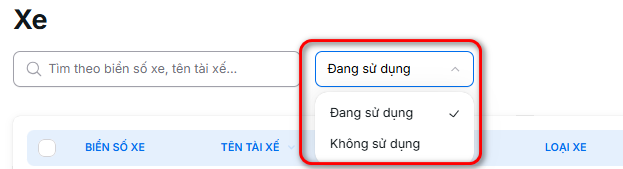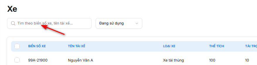 - Trên trang quản lý xe, bạn sẽ thấy một thanh tìm kiếm ở phía trên cùng. Nhập từ khóa tìm kiếm theo biển số xe hoặc tên tài xế vào ô tìm kiếm, hệ thống sẽ tự động lọc danh sách xe theo từ khóa bạn nhập.
