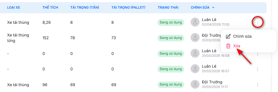 - Nhấn vào dấu ba chấm dọc (⋮) của xe muốn chọn → chọn xóa