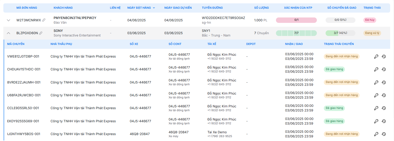 Trang này hiển thị chi tiết từng chuyến hàng và cho phép theo dõi hoạt động của đơn hàng.