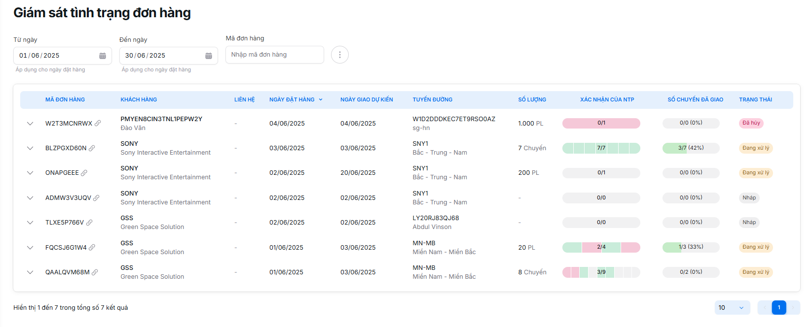 - Để xem chi tiết các chuyến hàng thuộc một đơn hàng cụ thể, nhấp trực tiếp hoặc rê chuột vào dòng Xác nhận của NTP của đơn hàng đó trong danh sách.