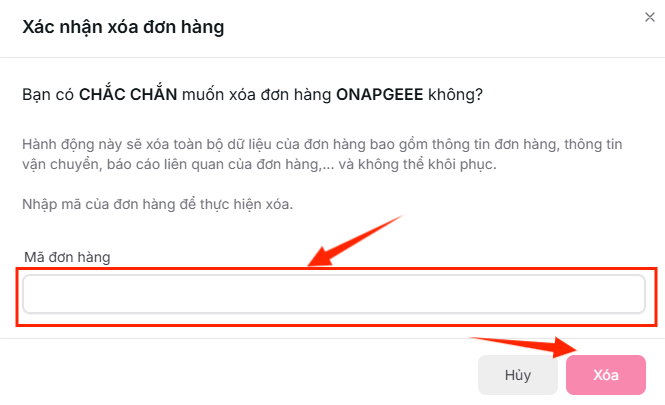 - Hệ thống yêu cầu xác nhận. Nhập mã đơn hàng (nếu cần) và nhấn Xóa để hoàn tất.