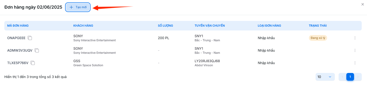 - Trong danh sách đơn hàng theo ngày, nhấp nút Tạo mới.