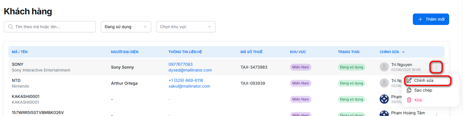 - Nhấn vào dấu ba chấm dọc (⋮) của khách hàng muốn chọn → chọn Chỉnh sửa