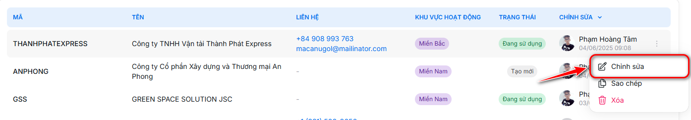 - Tìm đến nhà thầu phụ mà bạn muốn cập nhật thông tin trong danh sách.
